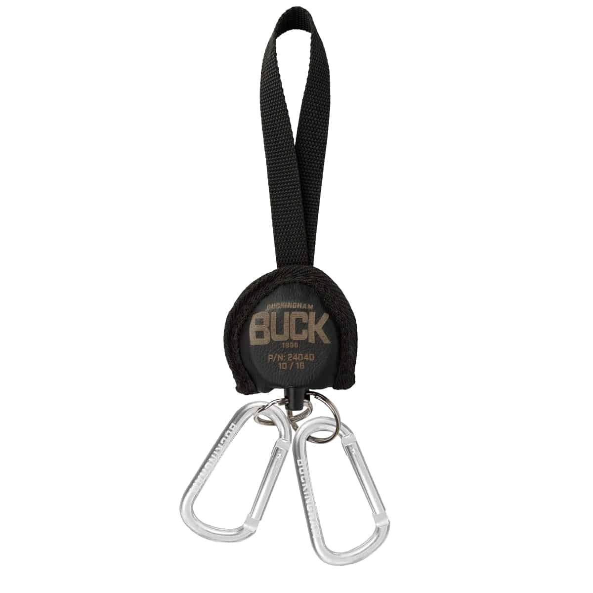 The BuckTender is a lightweight, compact retractable designed to keep excess slack from the tail of the BuckAdjust™ secondary lanyard or wood pole fall restriction device out of the way while climbing and working.