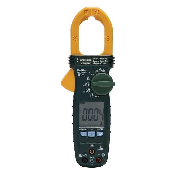 The Greenlee CMI-600 Clamp Meter is a hand-held testing device with the following measurement capabilities: AC and DC voltage, AC current, AC current AmpTip™, frequency, non-contact electric field (EF) detection, and resistance. It also checks diodes and verifies continuity. These clamp meters are designed to be placed on or removed from insulated or uninsulated conductors.