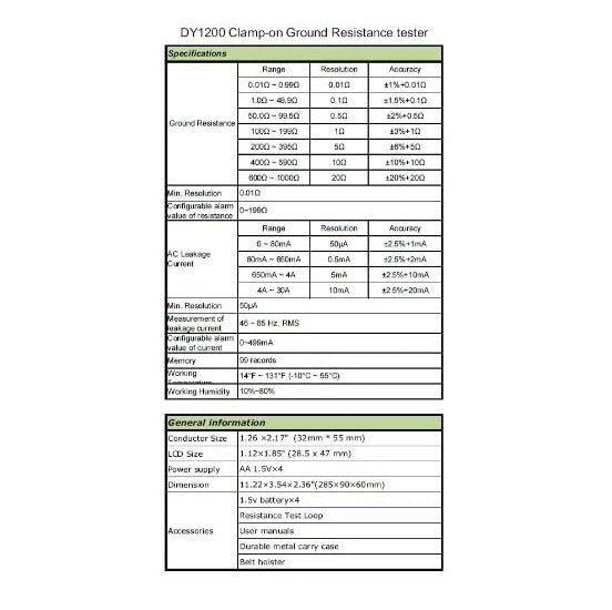 - Autoranging ground resistance measurements from 0.01Ohm to 1000Ohm with 0.01Ohm resolution