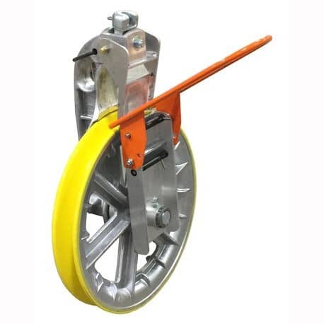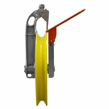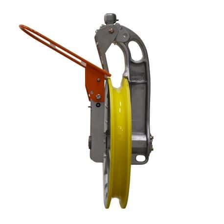 DDIN Helicopter Blocks are ideal for stringing multiple sizes of single overhead conductors where the pilot line will be flown in.  A unique feature of these blocks is the exclusive “Snap Lock” fold-away helicopter arm, which eliminates the need for removing pins to deploy or retract the fly arm.