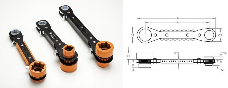 Lowell Bolt Thru Ratchet Wrench for linemen has five socket sizes in a single wrench with a triple square socket on one end and a double hex socket on the other. Oversize reversing levers on both ends. Twice as strong as standard ratchet box wrenches.