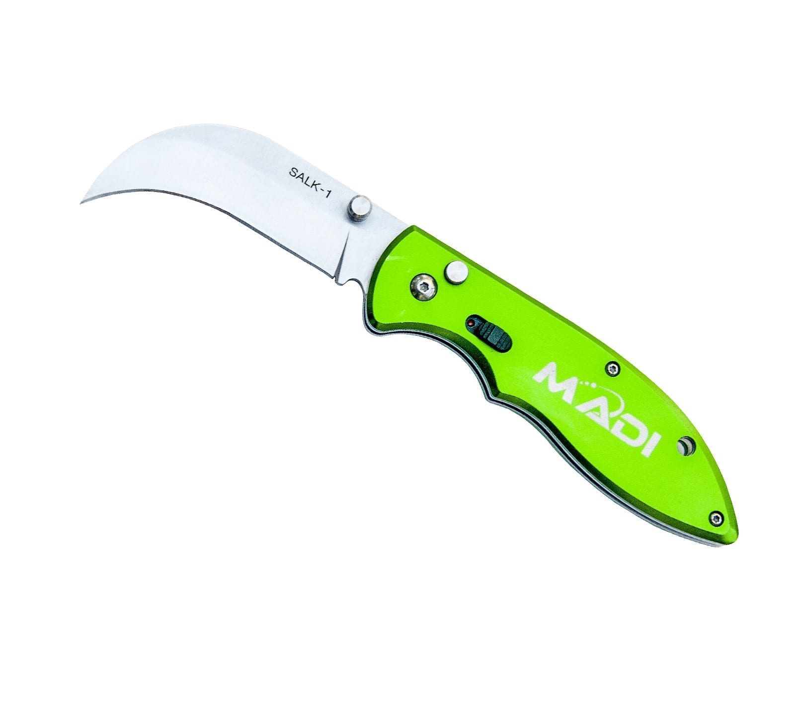 The MADI Spring Assisted Lineman knife features a thumb stud opening with a spring-assisted action for convenient one-handed opening. Hawkbill blade.