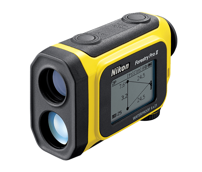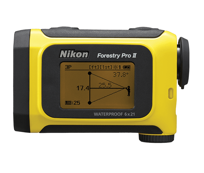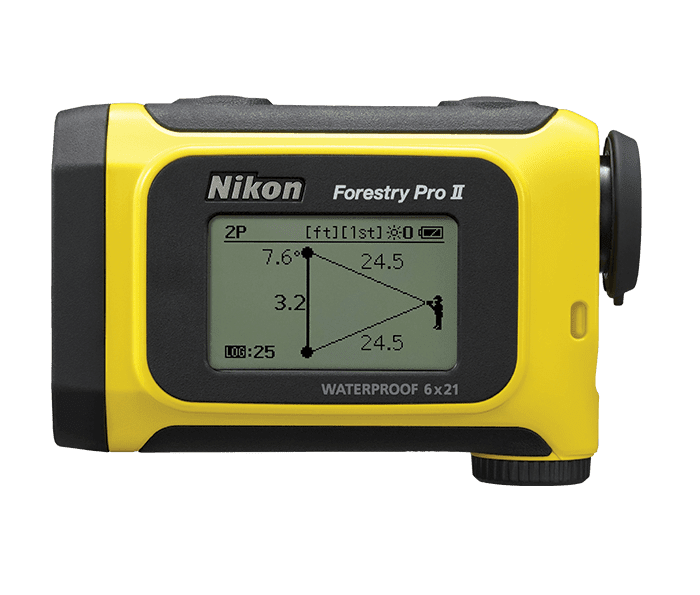 The Forestry Pro II laser rangefinder/hypsometer brings an all-new level of capability, convenience, and value to forestry, utility, and other industrial and commercial applications. Inheriting a long list of base attributes from its highly-acclaimed predecessor—the Nikon Forestry Pro—the Forestry Pro II model adds enhanced ranging capability, improved accuracy, and faster response time for increased confidence in every measurement result. In addition, a new log function for storing up to 250 measurement results has been integrated into the Forestry Pro II.