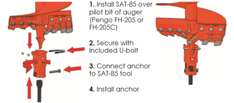 SAT-85 tools allow for installation of “no wrench screw anchors” with any diameter Pengo standard MD auger. The tools allow most anchors driven by an eyelet including Thimbleye or Tripleye type eyenuts to be installed without removing the auger.