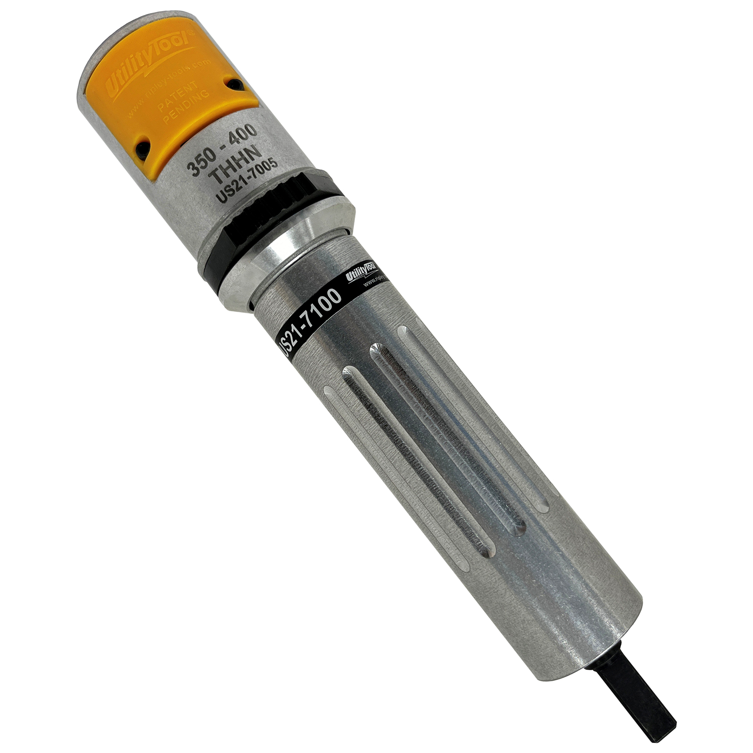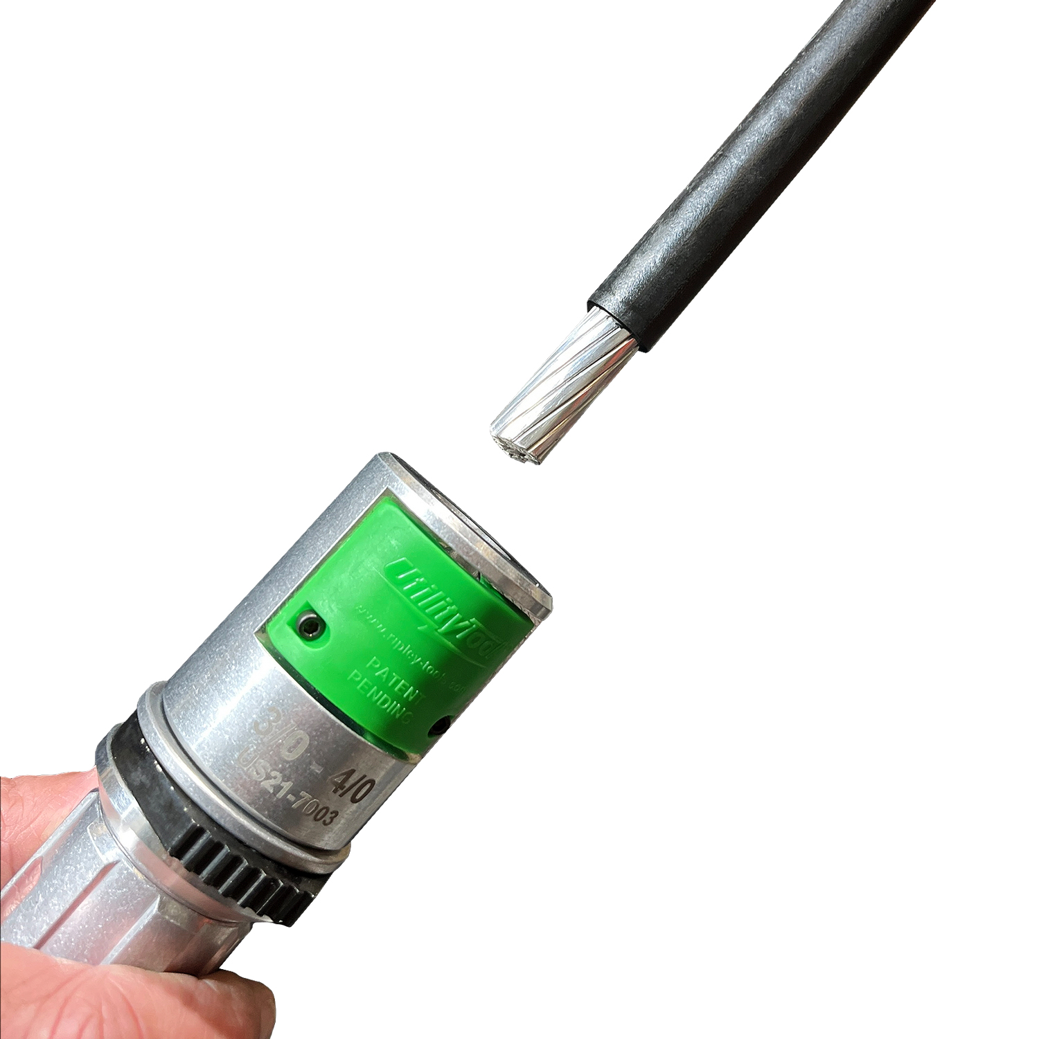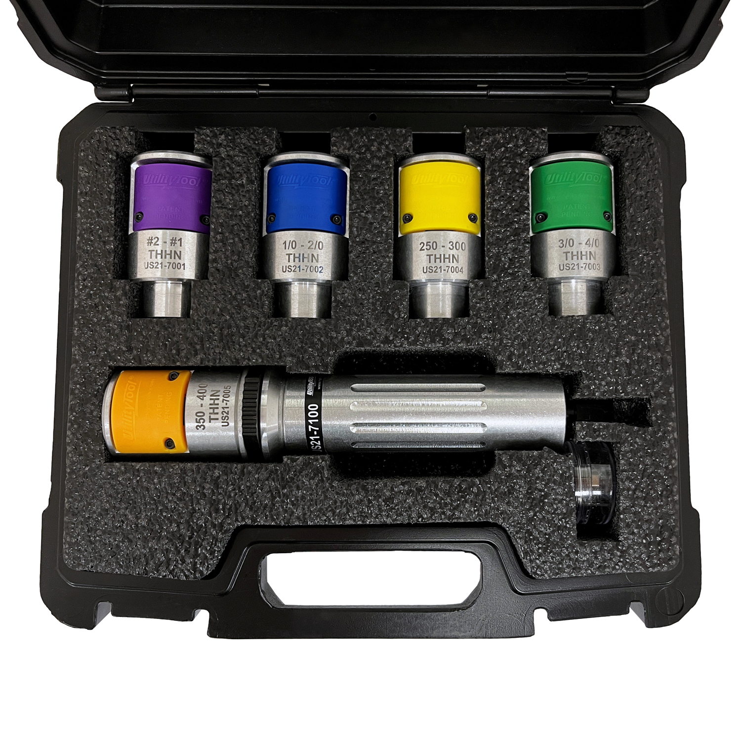 The Ripley VariStrip THHN All-In-One Stripping Kit is designed for safe and efficient insulation removal from Copper and Aluminum THHN cables with a #2 – 400 MCM conductor size range. The kit is composed of a drill-drive tool body and five variable stripping bushing assemblies. The tool body is built with a convenient snap collar and can be adjusted for a desired strip length. Each stripping bushing employs a dynamic spring loaded cable positioner that increases the bushing size range to multiple conductor sizes and also compensates for cable manufacturing tolerances.
