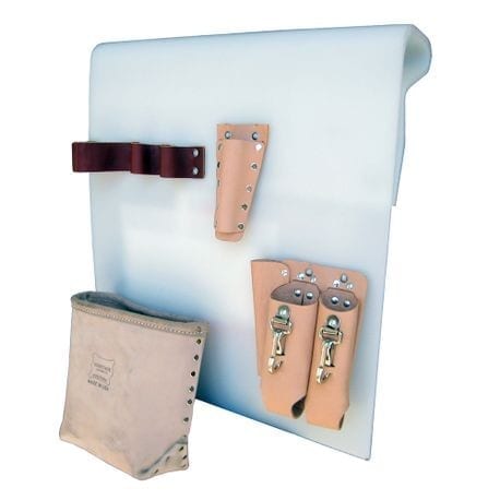Copolymer tool organizer board 18 x 20 x 1/4″ with leather tool loops, leather knife sheath, leather tool holder, and leather bag for bucket trucks and aerial lifts.