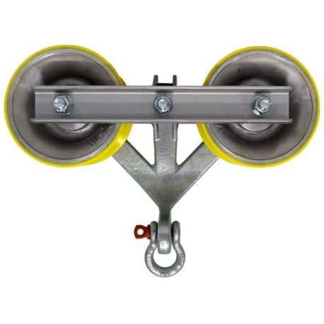 DDIN Uplift/Hold Down Blocks are designed to hold the pulling line or conductor down when they tend to float or rise up out of the stringing block groove. Can also be used to lower conductor for inspection or other work. The 7″ lined rollers are in tandem to help reduce bending of the conductor. Accepts wire up to 1-3/4″ capacity.
